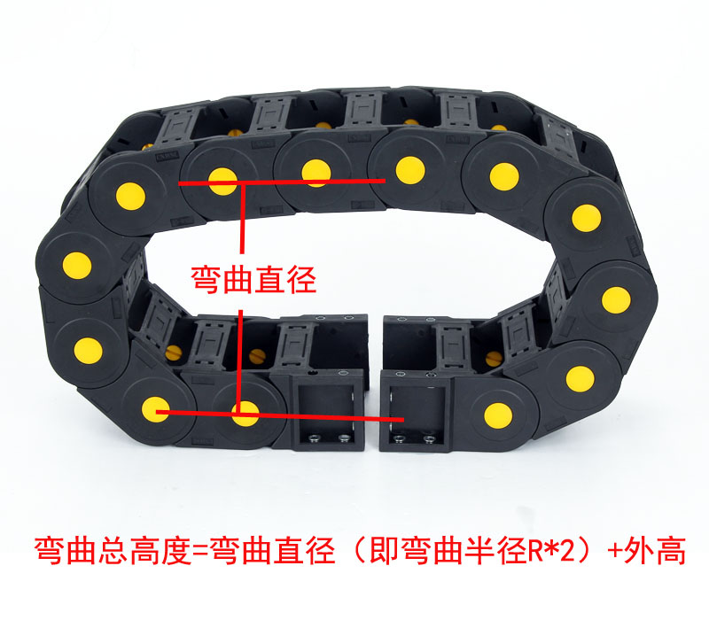 本公司每個規格的拖鏈都有多種彎曲半徑可供客戶選擇(彎曲半徑不影響價格),大家選擇的時候需要注意所需要保護的電線電纜的一個彎曲度,另外就是拖鏈安裝在機械上所預留的一個安裝空間高度,一定要高于拖鏈的彎曲總高度。拖鏈彎曲總高度=拖鏈彎曲半徑*2+外高。如對此選擇還有什么疑惑的大家可以隨時聯系我們的客戶,我們會根據我們的專業知識給您一個合適的建議。